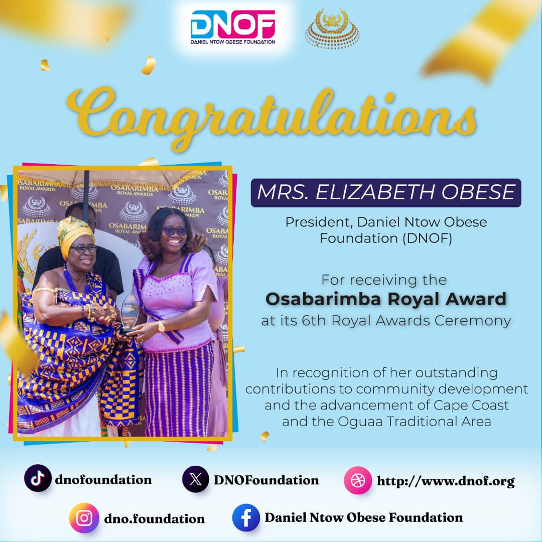 The Daniel Ntow Obese Foundation (DNOF) is delighted to announce that its President, Mrs. Elizabeth Obese, has been honoured with the prestigious Osabarimba Royal Award at the 6th Royal Awards Ceremony.